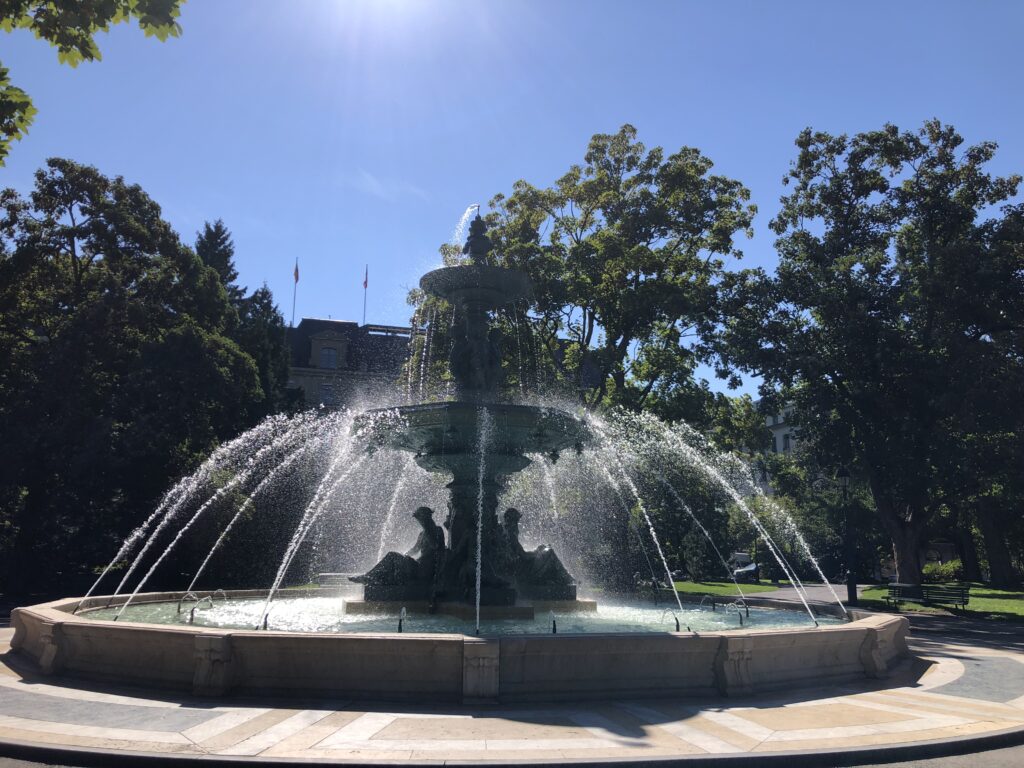 We stappen na 20 minuten uit en zitten direct midden in het centrum. Enorme grote en chique panden. We lopen richting het water, want we willen natuurlijk ontzettend graag die enorme fontein zien!