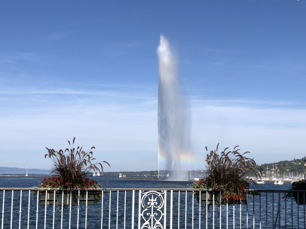 Na daar een tijdje gewacht te hebben, besluiten we dan maar om toch verder te gaan lopen. We lopen een stuk de stad in, alleen maar chique winkels. Nog nooit zulke hoge prijzen in etalages gezien. Bizar! Dan toch maar terug wandelen, want dit is zeker niet te betalen. Wat denk je dat we zien in de verte? De fontein! Snel, we gaan kijken! We komen dichterbij en de fontein gaat weer uit. Wat is dit nou… Blijven we het nu missen? We gaan weer op het bankje in het park zitten en wachten… En jahoor! Daar is die dan, de fontein en door het prachtige weer met de verschijning van een regenboog. Toch wel bijzonder dat dit zo ’n belangrijke fontein is, terwijl het eigenlijk gewoon een fontein is. Alleen dan 140 meter hoog. Zal wel mijn nuchterheid zijn denk ik haha.