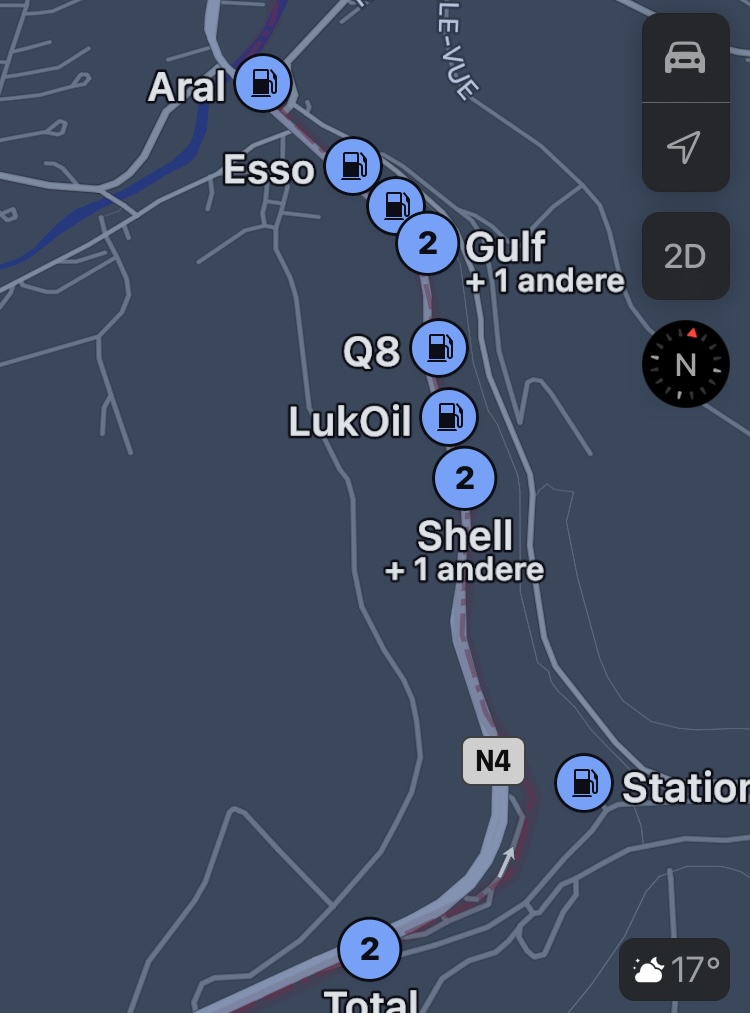 Rond 10.00 uur zijn we vanochtend vertrokken vanuit La-Folie. Allereerst om een tankstation uit te kiezen. Waarom uitkiezen zul je denken? Misschien omdat Martelange maar liefst 12 tankstations strak naast elkaar heeft zitten (zie foto). Zoiets zijn wij in ieder geval nog nooit tegen gekomen. Luxe probleem?